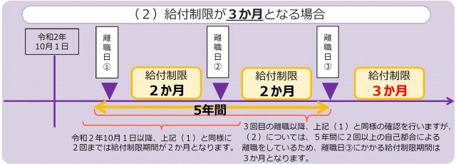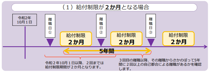 令和2年10月1日以降に離職された方は、正当な理由がない自己都合により退職した場合であっても、5年間のうち2回までは給付制限期間が2か月となります。